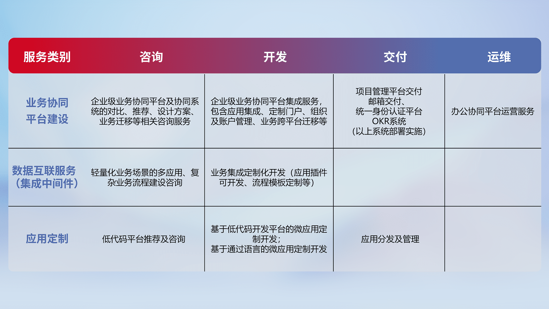 针对钉钉、、企微、、、、IDaas等平台级产品提供产品的规划、、、方案、、、交付、、、、定制化开发等服务,,,实现如统一协同办公、、、、智能客户服务、、、、混合会议管理、、、智能数据查询、、等业务场景,,,实现数字化转型。。。