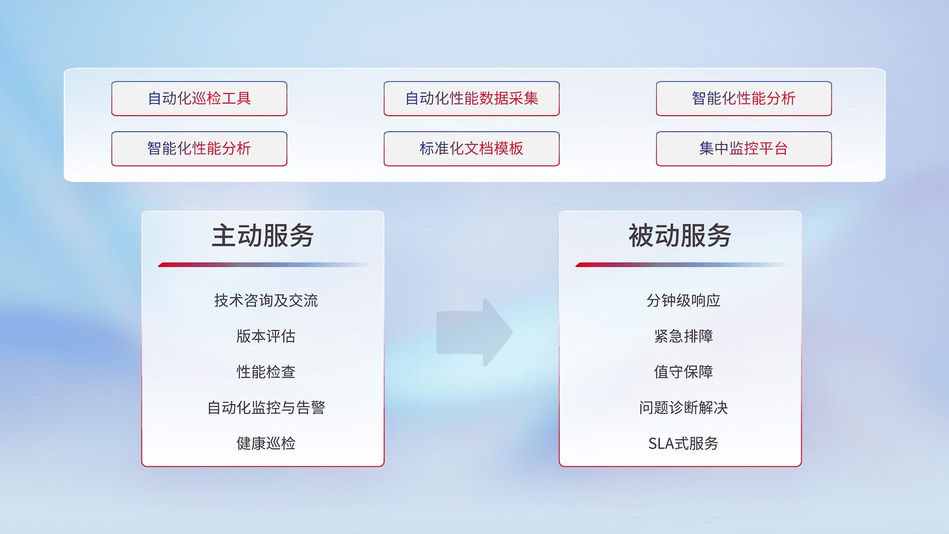 智能化工具和标准化文档,,,,保障服务质量,,,,提供主动服务(包含技术咨询、、、版本评估、、、、性能检查、、、自动化监控与告警、、健康巡检)和被动服务包含(分钟级响应、、、、紧急排障、、、值守保障、、、问题诊断解决、、、SLA服务)。。。。
